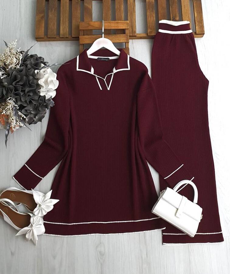 FONLE YAKALI İNCE BEYAZ GEÇİŞLİ DOKUMA TRİKO TAKIM A8-5-8146-04-BORDO