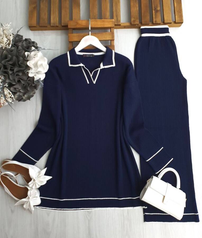 FONLE YAKALI İNCE BEYAZ GEÇİŞLİ DOKUMA TRİKO TAKIM A8-5-8146-12-LACİVERT