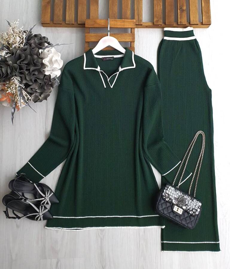 FONLE YAKALI İNCE BEYAZ GEÇİŞLİ DOKUMA TRİKO TAKIM A8-5-8146-27-ZÜMRÜT