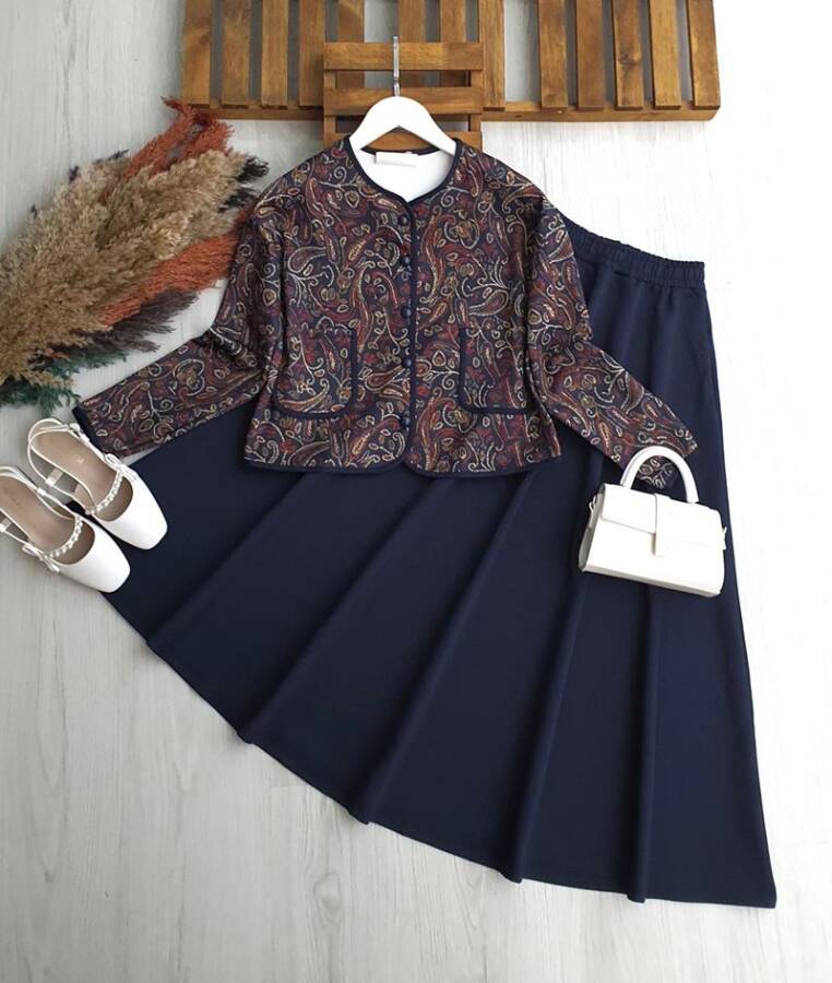 FORE ŞAL DESEN ÖNÜ DÜĞMELİ BİYELİ ETEKLİ TAKIM 1707-12-LACİVERT