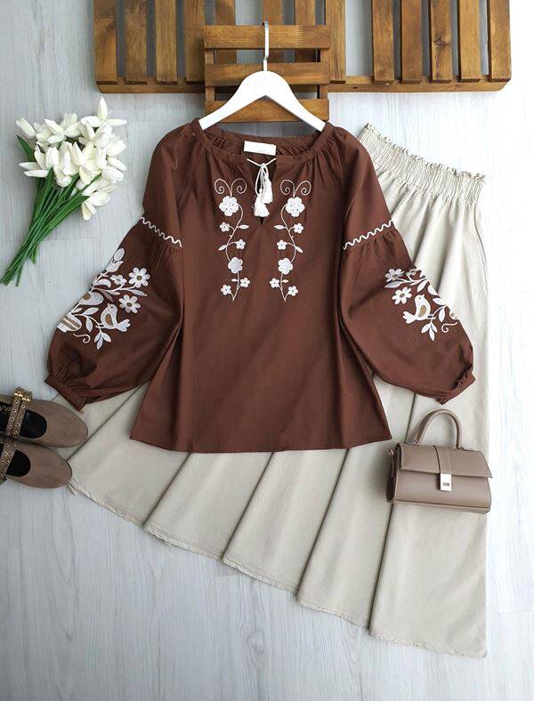 FUBCE BALON KOL NAKIŞLI GÖMLEK 5715-37-KAHVE