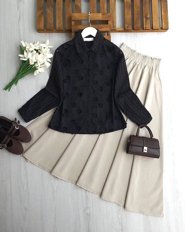 FUBCE İŞLEMELŞ NAKIŞLI YAKA VE KOL FİSTO GÖMLEK 5714-01-SİYAH