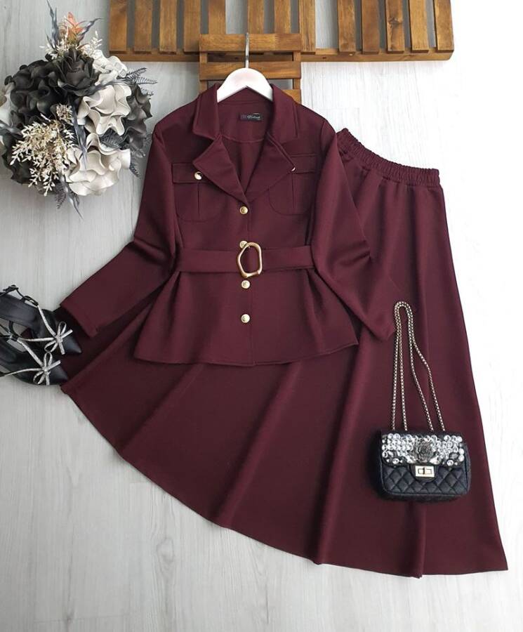 FUBE GOLD DÜĞMELİ ÇİFT CEP TOKALI KEMERLİ CEKET KİLOŞ ETEK 1691-04-BORDO