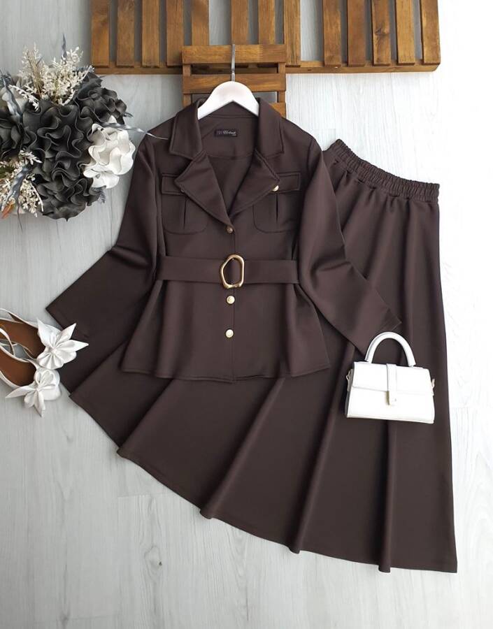 FUBE GOLD DÜĞMELİ ÇİFT CEP TOKALI KEMERLİ CEKET KİLOŞ ETEK TAKIM B3-7-1691-37-KAHVE