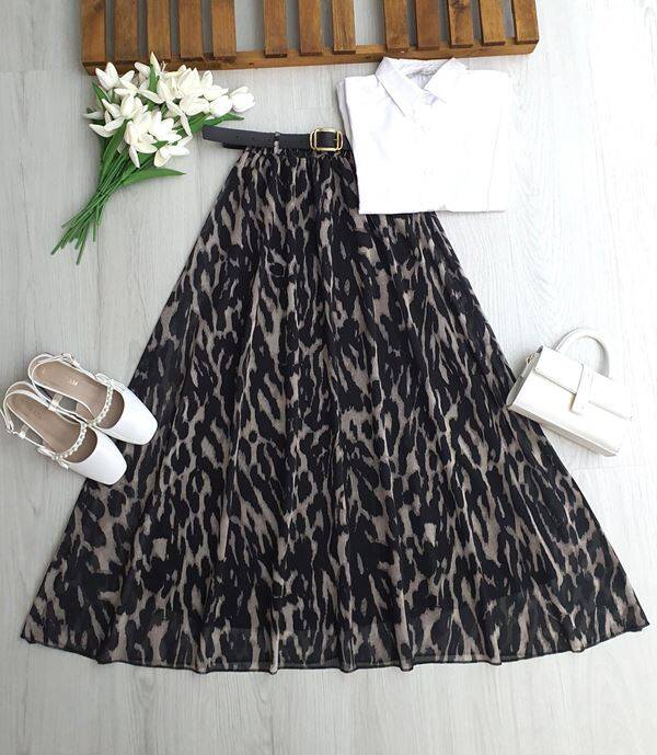 FUDS LEOPAR DESEN DERİ KEMERLİ BELİ LASTİKLİ ASTARLI ŞİFON ETEK A4-2-6109-01-SİYAH