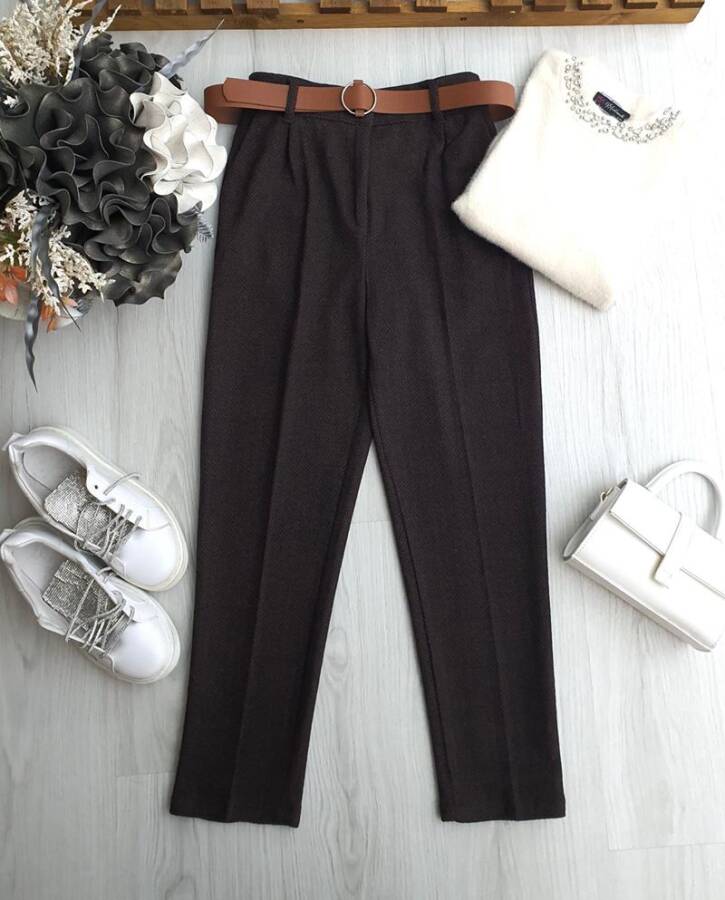 FUZAN BELİ DÜĞMELİ VE LASTİKLİ DERİ KEMERLİ BALIKSIRTI DAR PAÇA PANTOLON 6095-37-KAHVE
