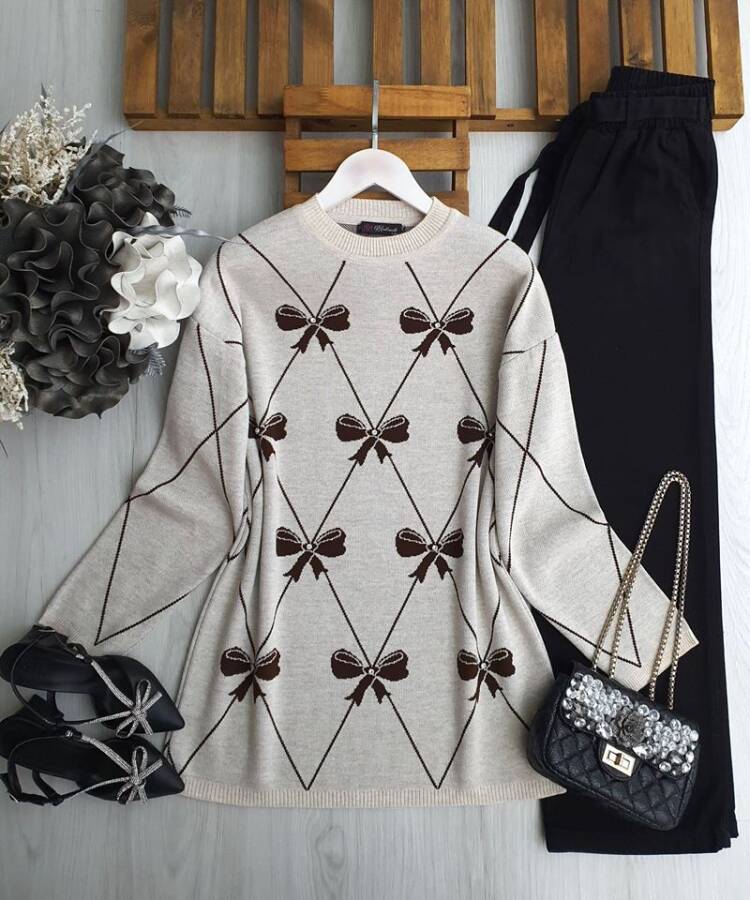 GAMEZ TAŞLI FİYONK DESENLİ TRİKO TUNİK 8151-34-BEJ
