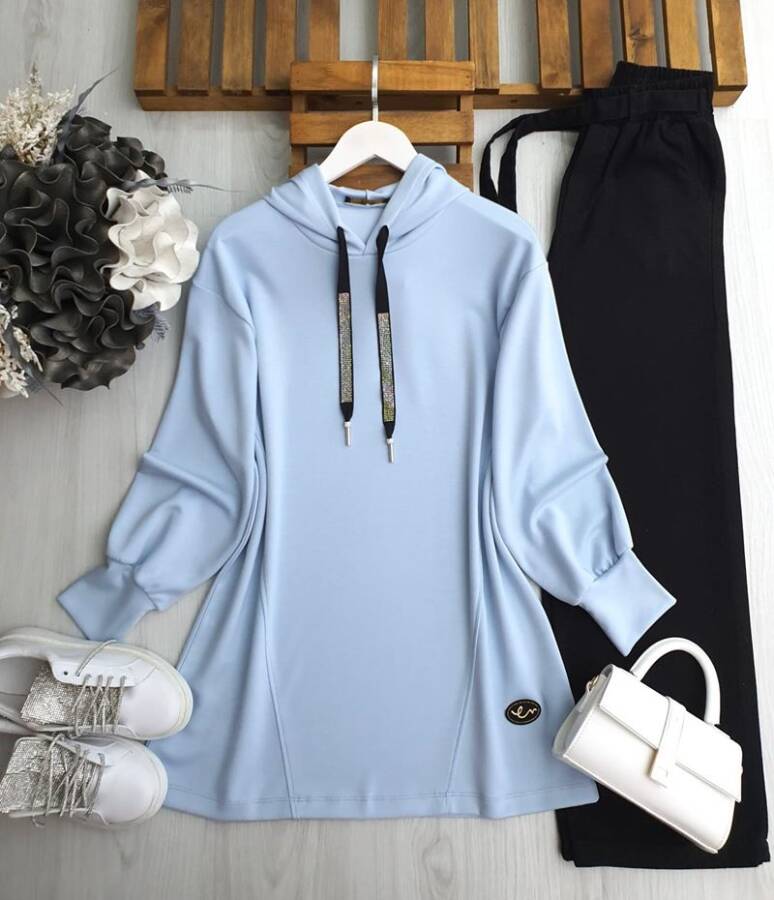 GAWE TAŞLI BAĞCIKLI ARMALI KAPŞONLU TUNİK B3-4-5612-10-MAVİ