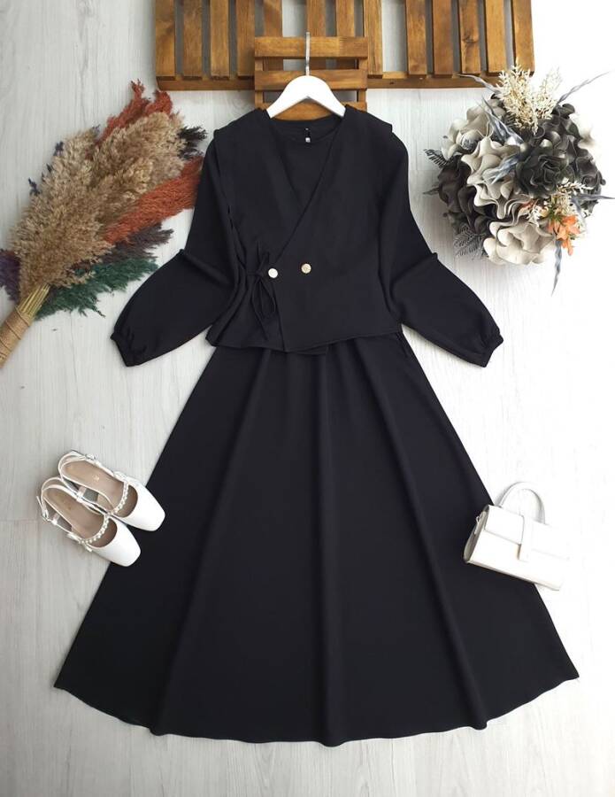 GESLAS YAN BAĞLAMA YELEK BELİ LASTİKLİ ELBİSE TAKIM 2416-01-SİYAH