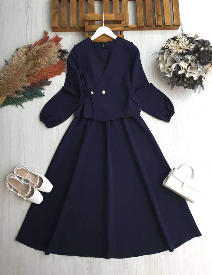 GESLAS YAN BAĞLAMA YELEK BELİ LASTİKLİ ELBİSE TAKIM 2416-12-LACİVERT