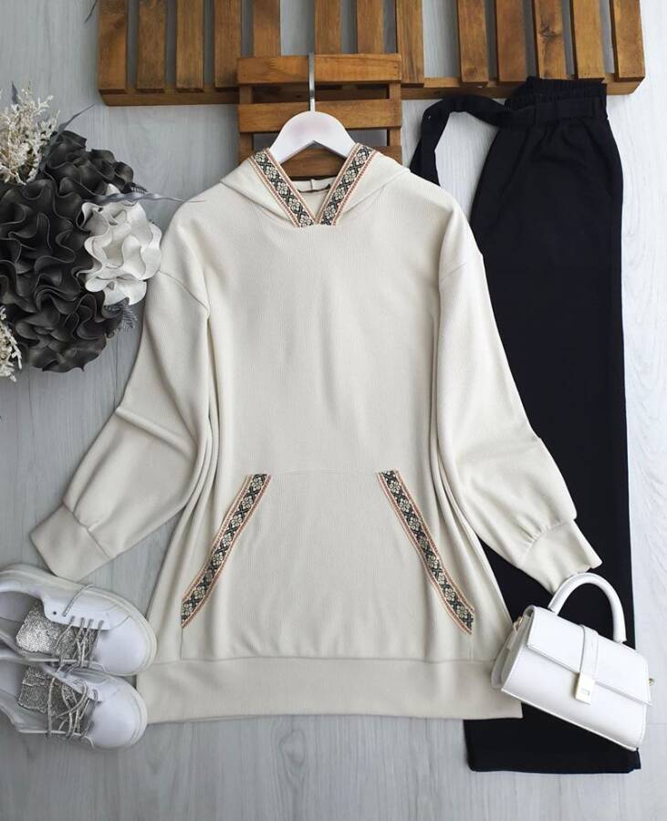 GOLEN KANGURU CEP ETNİK DESEN ŞERİTLİ TUNİK 5644-34-BEJ