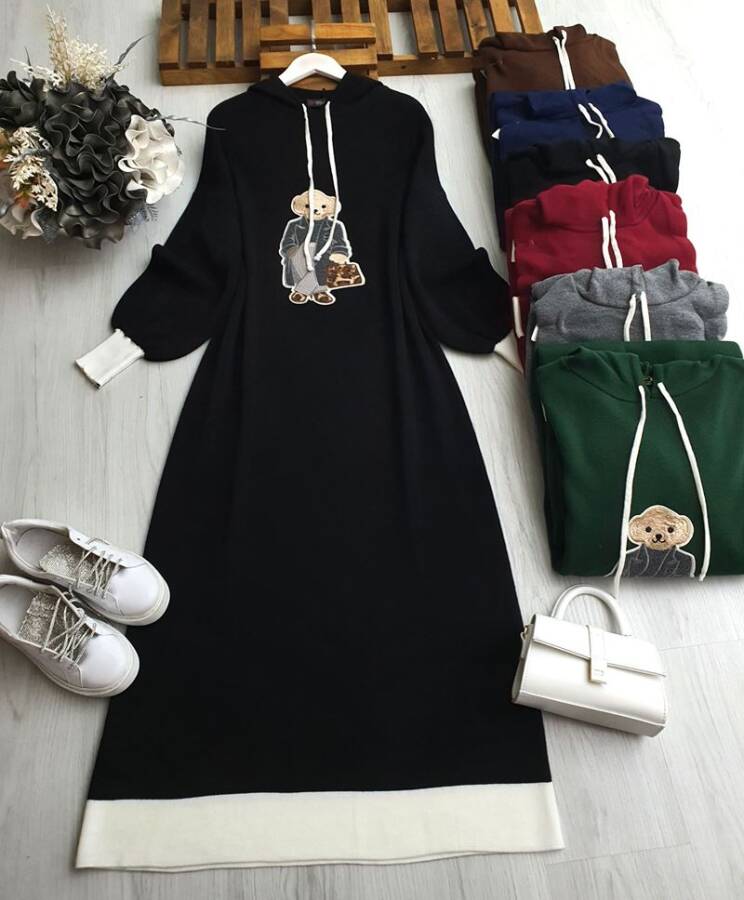 GUBE KAPŞONLU AYICIKLI DOKUMA TRİKO ELBİSE 8140-01-SİYAH