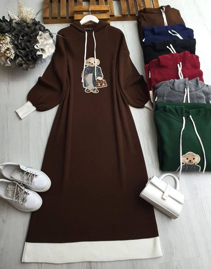 GUBE KAPŞONLU AYICIKLI DOKUMA TRİKO ELBİSE 8140-37-KAHVE