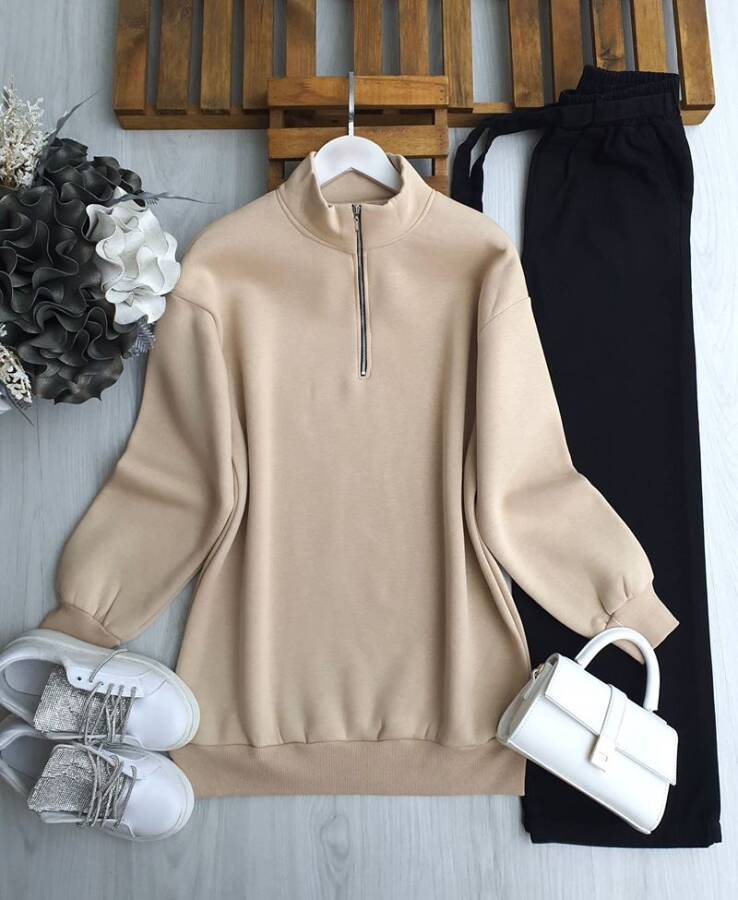 HAMEL DİK YAKA YARIM FERMUARLI ÜÇ İPLİK TUNİK B8-1-5637-34-BEJ