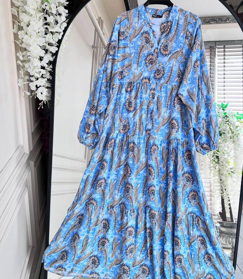 HENFE PATLI DESENLİ YARIM DÜĞMELİ SALAŞ ELBİSE D5-2329-10-MAVİ