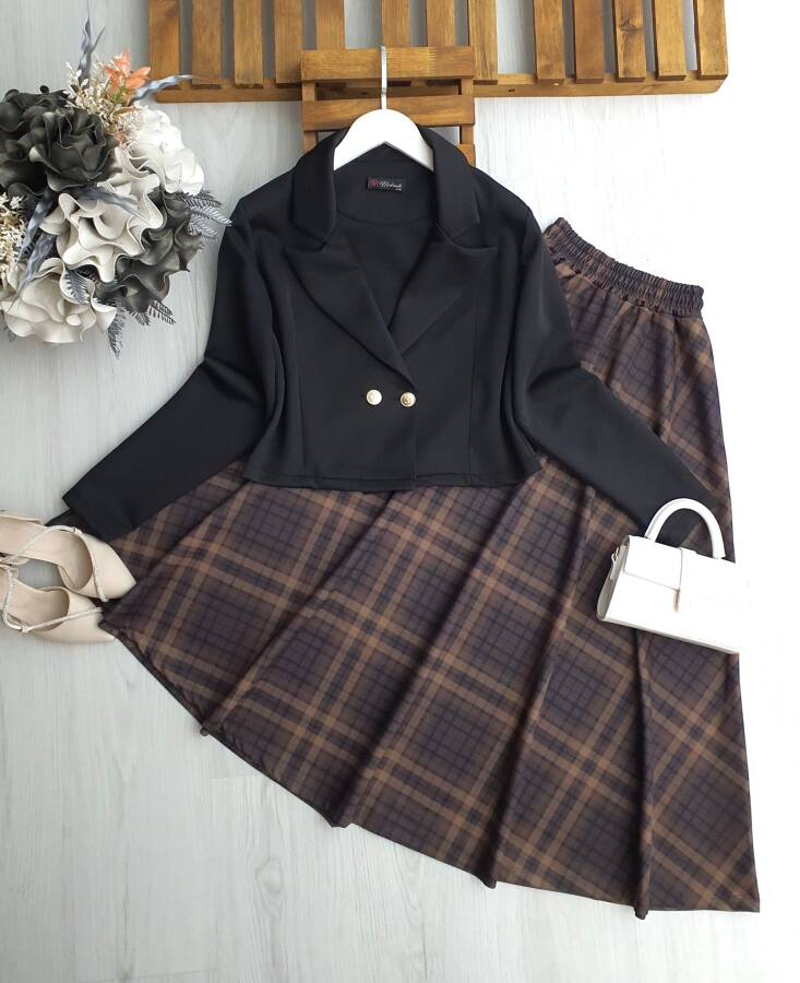 HEQ KARELİ EKOSE ETEK ÇİFT DÜĞME CEKET TAKIM B5-2-1701-01-SİYAH