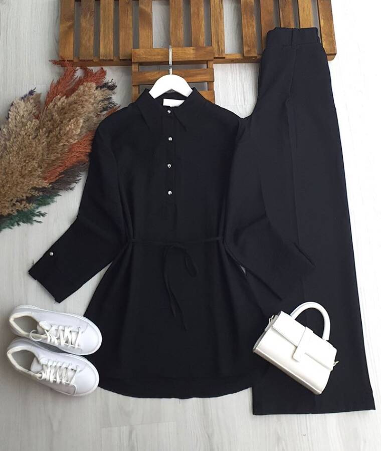 HESEV KOLU PATLI BELİ İPLİ GÖMLEK TUNİK B1-2-5661-01-SİYAH