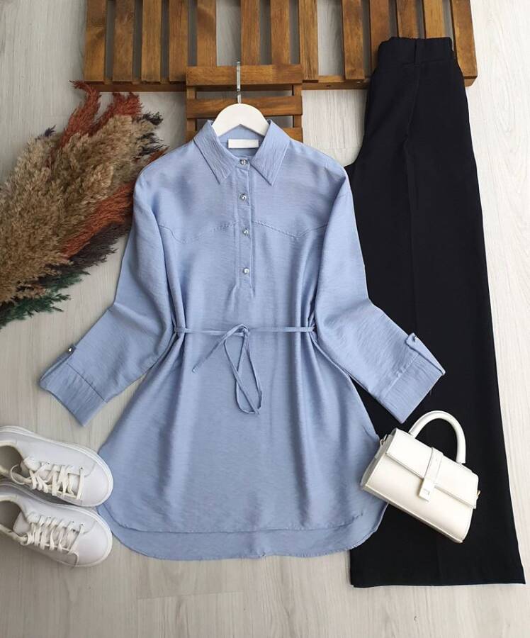 HESEV KOLU PATLI BELİ İPLİ GÖMLEK TUNİK B1-2-5661-10-MAVİ