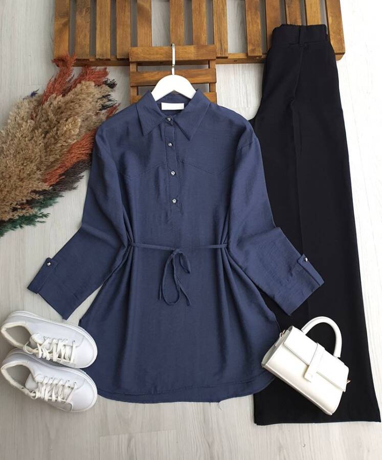 HESEV KOLU PATLI BELİ İPLİ GÖMLEK TUNİK 5661-11-İNDİGO