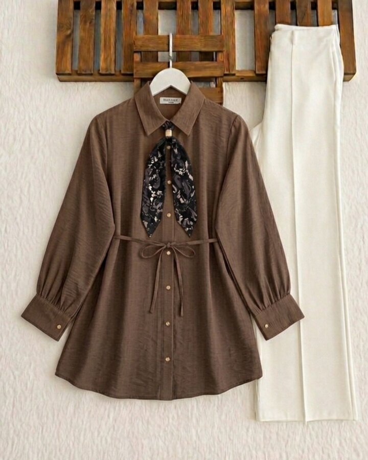 OHLEN FULARLI KOLYELİ GÖMLEK TUNİK B5-4-5733-37-KAHVE