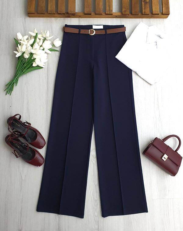 HUFSE ÇİMALI DERİ KEMERLİ PALAZZO PANTOLON A7-4-6116-12-LACİVERT
