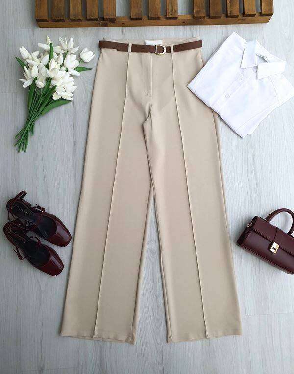 HUFSE ÇİMALI DERİ KEMERLİ PALAZZO PANTOLON A7-4-6116-34-BEJ
