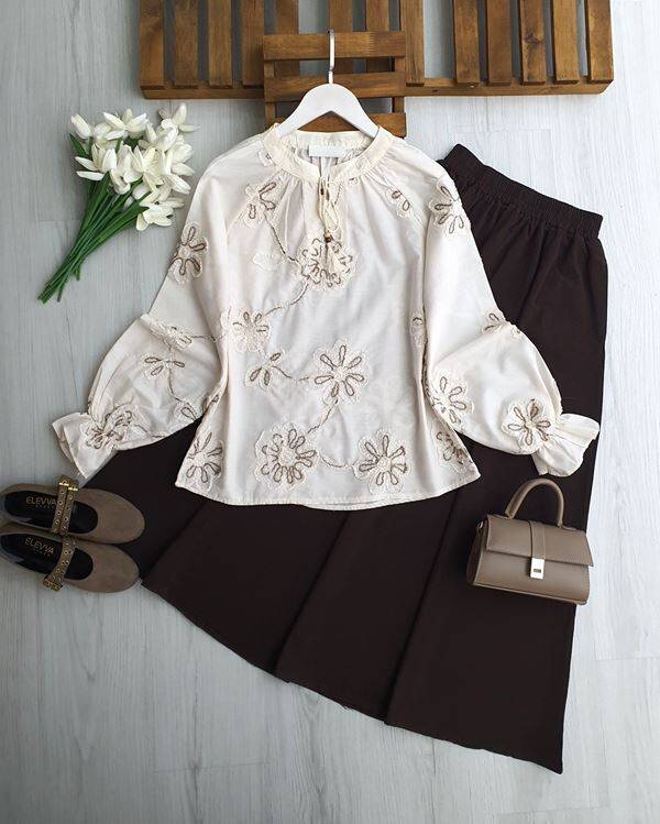 HUUF ÇİÇEK NAKIŞLI YAKA PÜSKÜLLÜ GÖMLEK 5728-34-BEJ