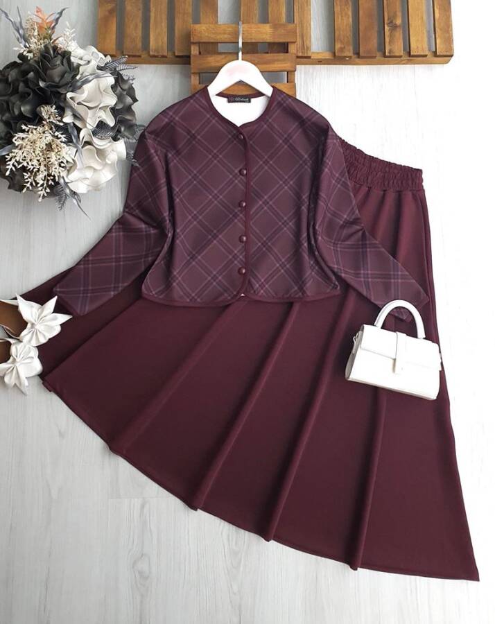 JAVSE ÖNÜ DÜĞMELİ EKOSE DESENLİ BİYELİ ETEKLİ TAKIM A6-5-1696-04-BORDO