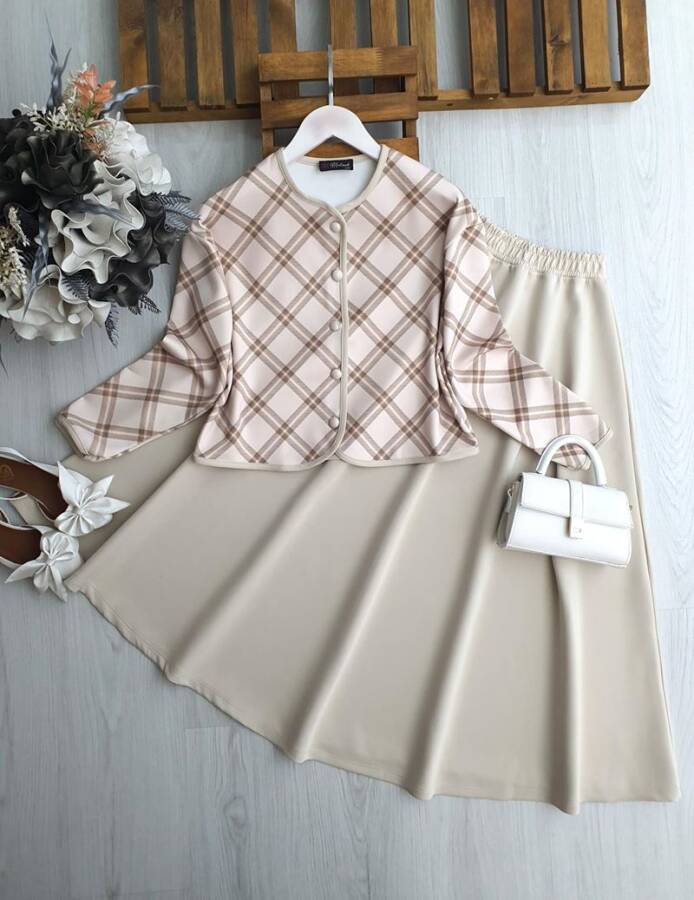 JAVSE ÖNÜ DÜĞMELİ EKOSE DESENLİ BİYELİ ETEKLİ TAKIM A6-5-1696-34-BEJ