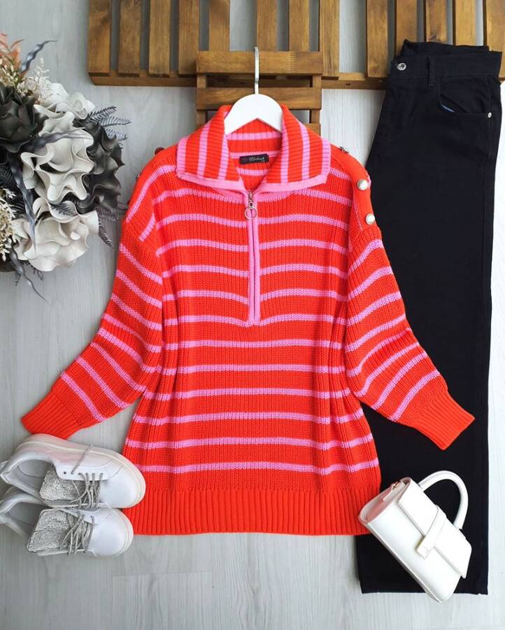 KAFC OMUZ DÜĞMELİ FERMUARLI KIVRIK YAKA TRİKO TUNİK B7-2-8177-15-ORANJ