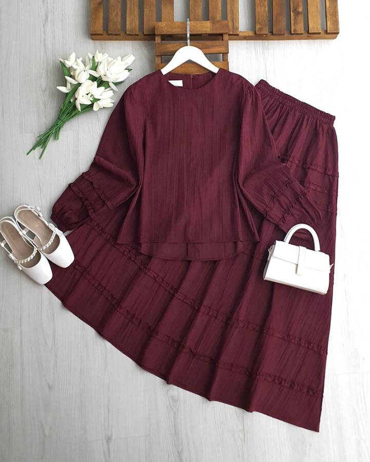 KİLME KOL VE ETEK KAT KAT FIRFIRLI NUBUK CUPRA ETEKLİ TAKIM 1720-04-BORDO