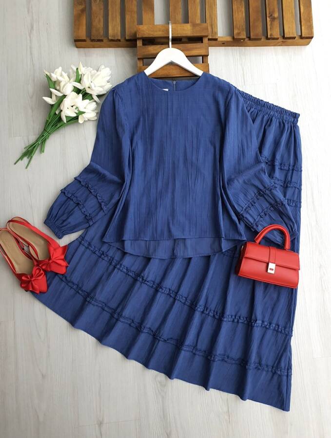KİLME KOL VE ETEK KAT KAT FIRFIRLI NUBUK CUPRA ETEKLİ TAKIM A6-3-1720-11-İNDİGO