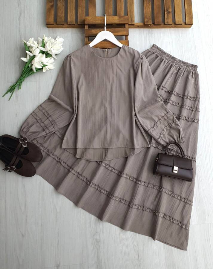 KİLME KOL VE ETEK KAT KAT FIRFIRLI NUBUK CUPRA ETEKLİ TAKIM 1720-25-VİZON