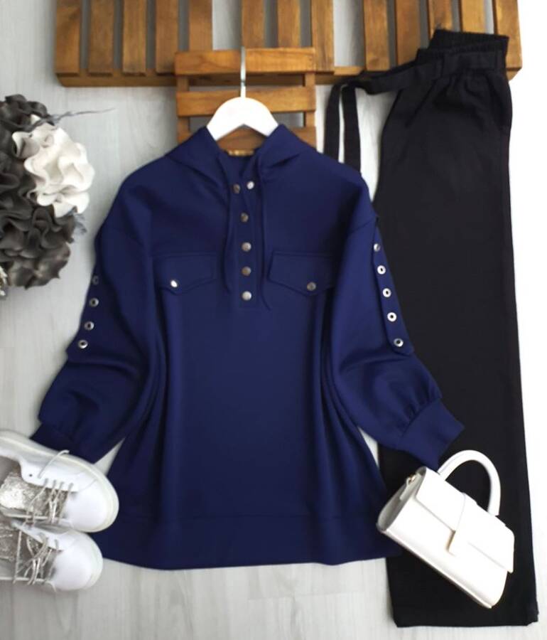 KOFL KUŞGÖZÜ KOL YARIM ÇIT ÇIT DÜĞMELİ CEP KAPAKLI TUNİK 5639-12-LACİVERT