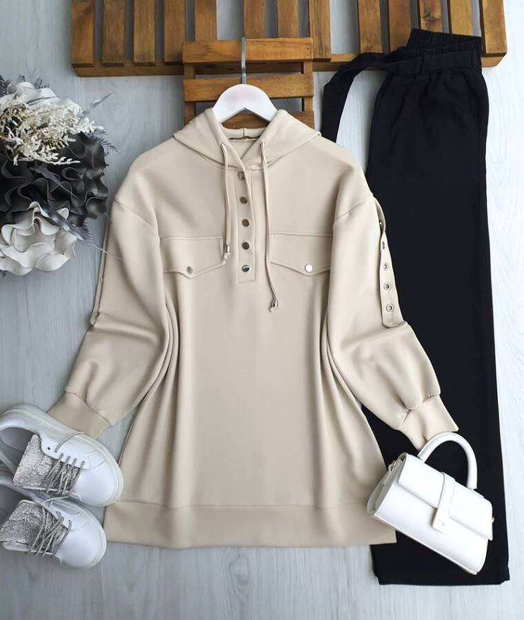 KOFL KUŞGÖZÜ KOL YARIM ÇIT ÇIT DÜĞMELİ CEP KAPAKLI TUNİK B3-6-5639-34-BEJ