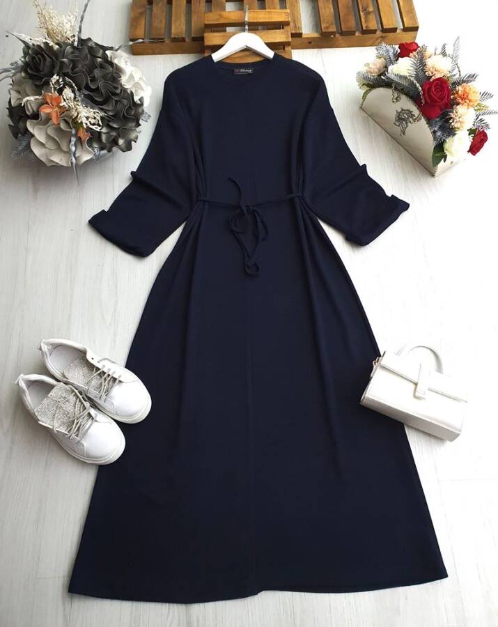 KUBES ÖNÜ DİKİŞLİ KIVRIK KOL BELİ İPLİ ELBİSE 2412-12-LACİVERT
