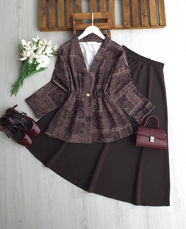 KUNFES TEK DÜĞME ETNİK DESEN CEKET ETEKLİ TAKIM 1729-37-KAHVE