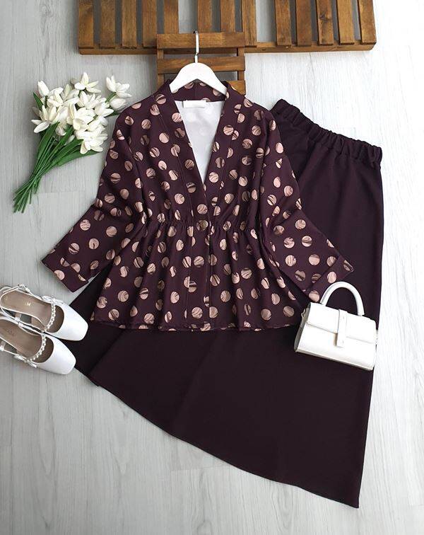 KUNFES TEK DÜĞME PUANTİYE DESEN CEKET ETEKLİ TAKIM 1730-04-BORDO