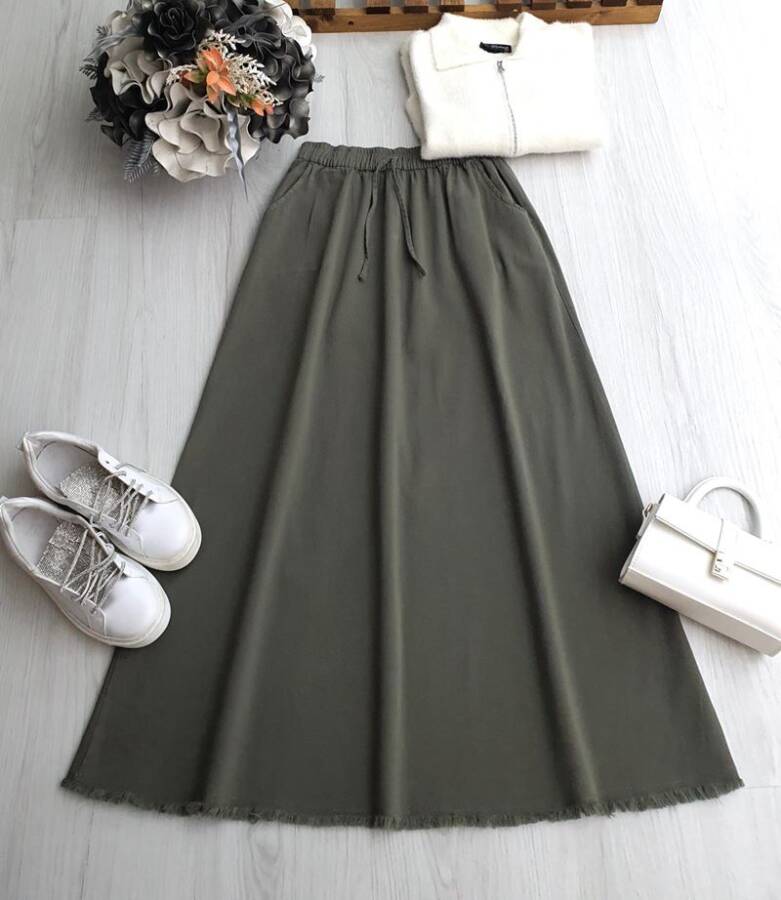 KUSLA PÜSKÜLLÜ CEPLİ BELİ LASTİKLİ GABARDİN ETEK 6079-09-HAKİ