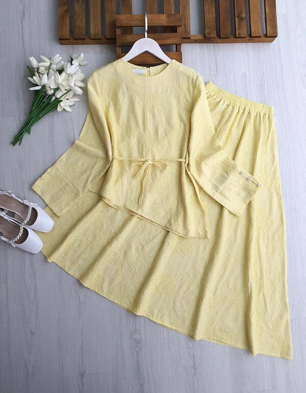 LAGD ASİMETRİK KESİM BELİ İPLİ BRODE ETEKLİ TAKIM 1755-23-SARI