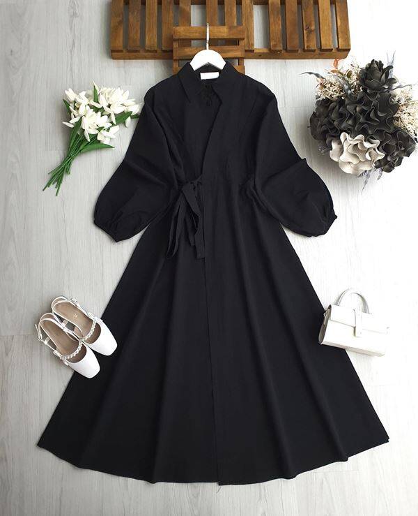 LANDE BOYDAN YAN BAĞLAMA PARÇALI YARIM DÜĞMELİ ELBİSE 2419-01-SİYAH