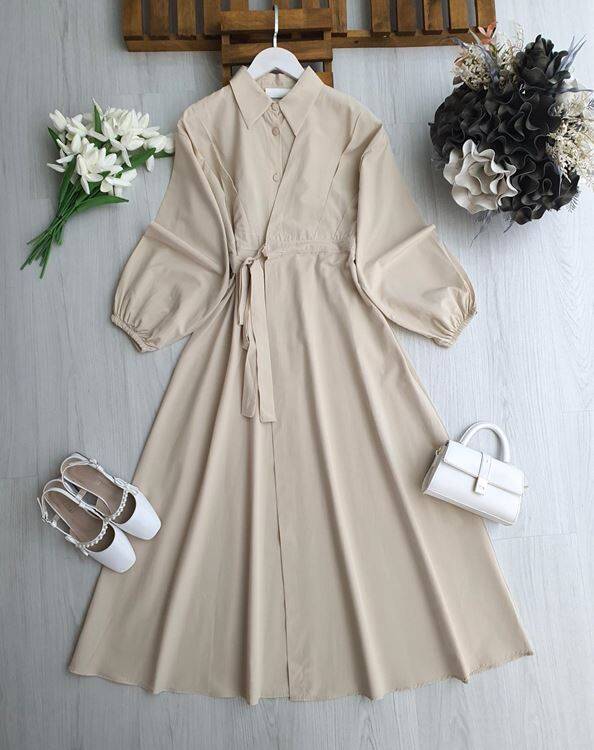 LANDE BOYDAN YAN BAĞLAMA PARÇALI YARIM DÜĞMELİ ELBİSE 2419-34-BEJ