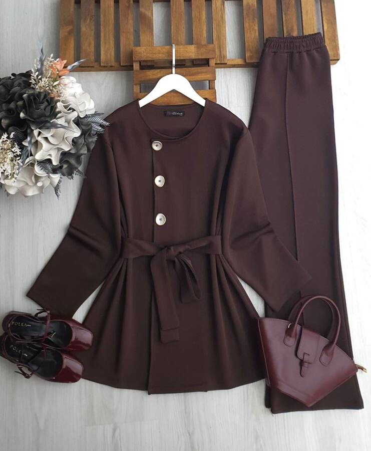 LANEC YAN DÜĞMELİ BELİ İPLİ İKİLİ TAKIM 1702-37-KAHVE