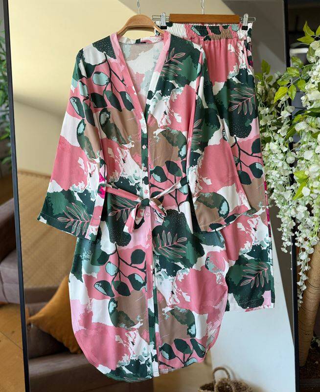LAWEB KUŞAKLI UZUN KİMONO PANTOLON İKİLİ TAKIM A10-6-1641-16-GÜL