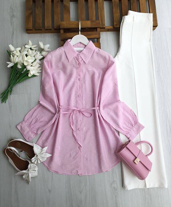 LEMG BELİ İPLİ KENDİNDEN DESENLİ BRODE GÖMLEK TUNİK A6-5-5697-05-PUDRA