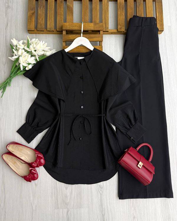 LENFE OMUZ PELERİN LOTUS GÖMLEK TUNİK 5681-01-SİYAH