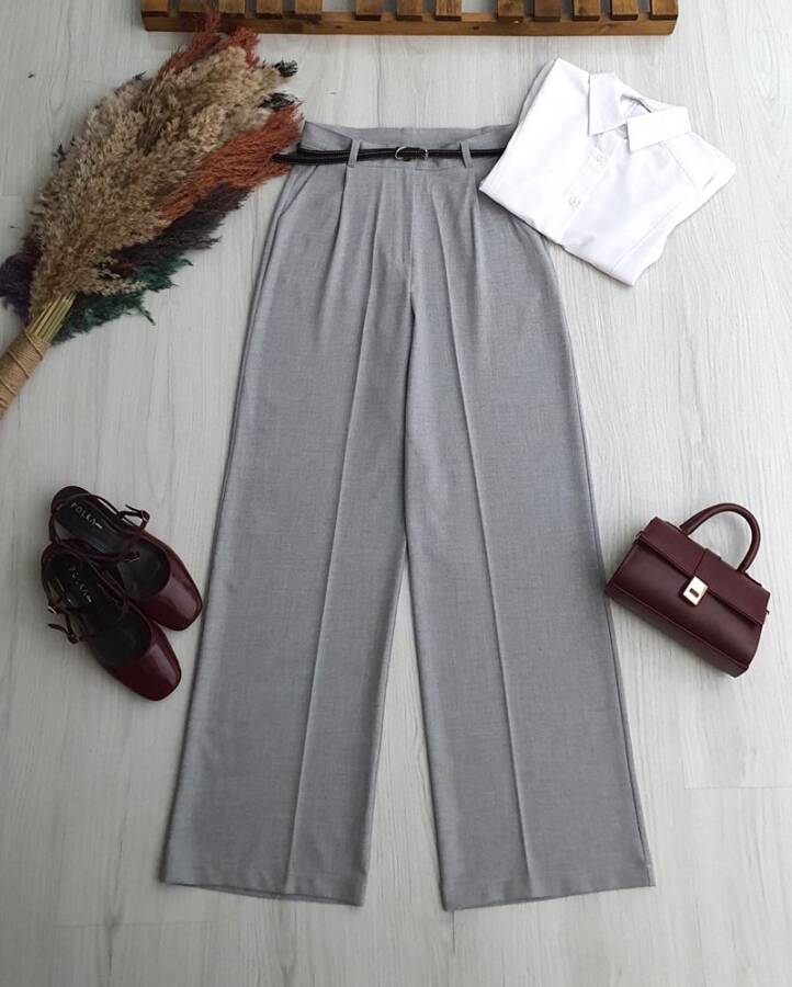 LEYSE İNCE DERİ KEMERLİ POLİVİSKON PALAZZO PANTOLON 6101-26-GRİ