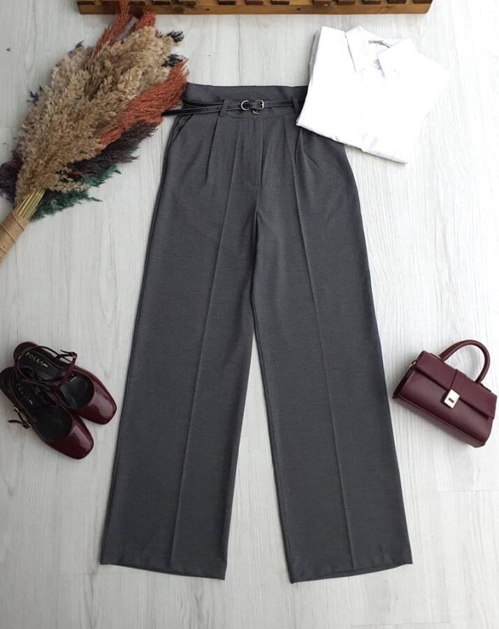 LEYSE İNCE DERİ KEMERLİ POLİVİSKON PALAZZO PANTOLON 6101-58-FÜME