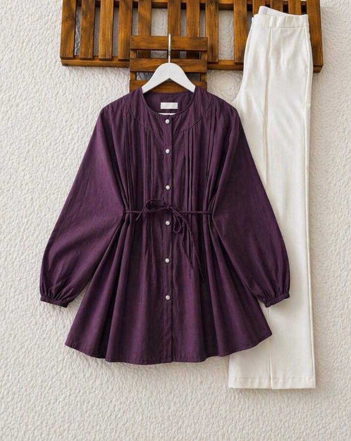 LİSN NERVÜR DİKİŞ DETAYLI SALAŞ GÖMLEK TUNİK 5735-18-MÜRDÜM