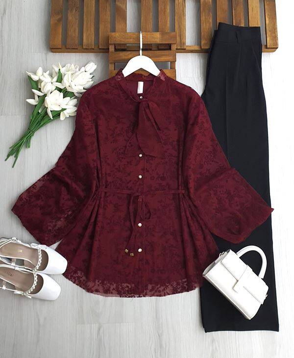 LONE YAKA BAĞLAMALI FLOK BASKILI ASTARLI TÜL GÖMLEK TUNİK 5688-04-BORDO